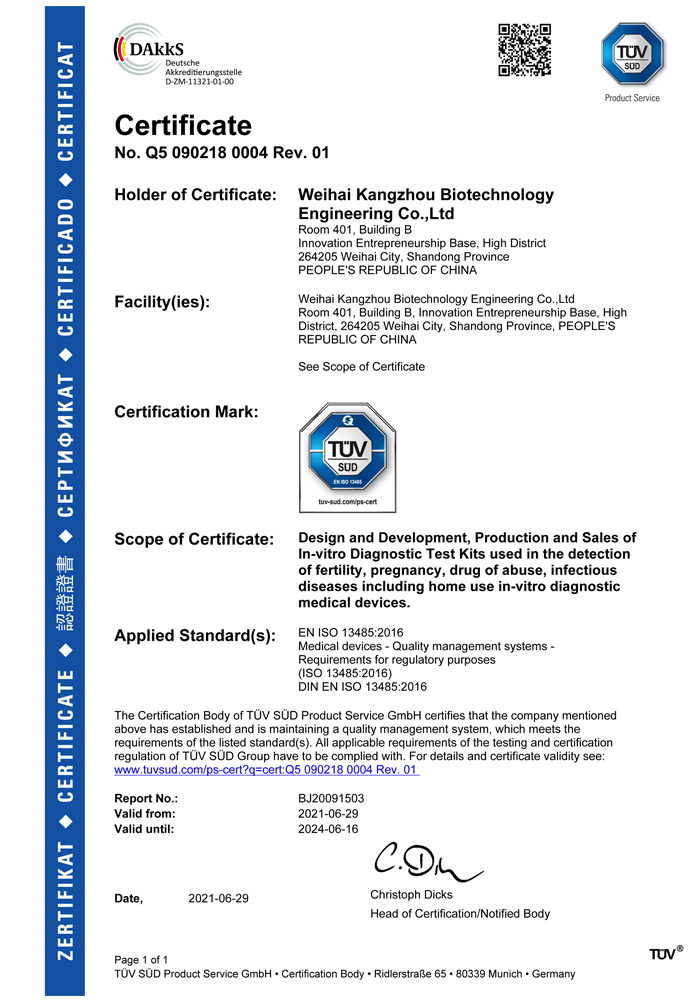 ? ? ?威??抵萆锕こ逃邢薰境闪⒂?013年,公司坐落于風景秀麗的海濱小城——威海市??抵萆锸羌邪l、生產和銷售于一體的生物科技公司,與威海哈爾濱工業大學合作研發團隊,擁有先進的科研基地及生產基地。主要從事快速診斷檢測產品的研發、生產、銷售。產品涵蓋:生育檢測、藥物濫用檢測、農藥殘留檢測以及其他臨床診斷檢測等。公司自主研發生產得早早孕試紙,排卵檢測試紙,毒品檢測及疾病檢測等醫用產品,經過歐盟認證,產品質量穩定,值得信賴。